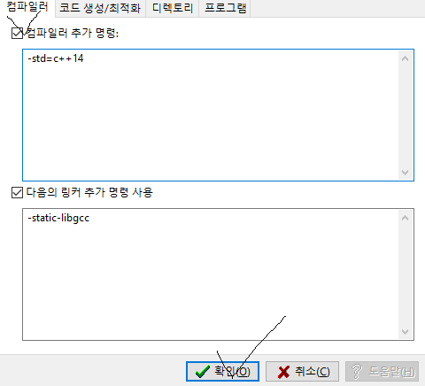 2. 컴파일러 추가 명령을 체크해주고, 그 밑 텍스트 박스 안에 -std=c++14 라고 적어준다.