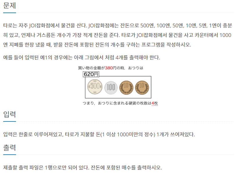 각 경우의 돈을 얼마나 쓸 수있는지 카운트 해주고, 거스름돈에서 쓸 수있는 돈을 계속 빼주면 된다.