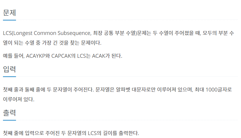 LCS라는 문제로 Longest Common Subsequence 최장 공통 부분 수열의 길이를 구하는 문제이다.
