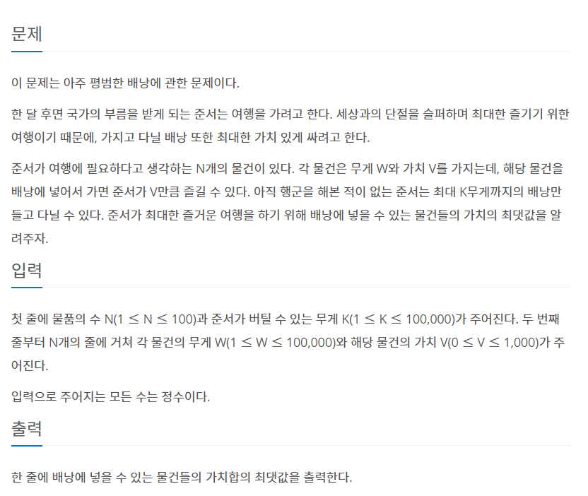 이번 문제는 일정한 무게와 가치가 주어질 때, 가치의 합이 최대가 되면서 짐을 고르게 하는 전형적인 냅색 문제이다.